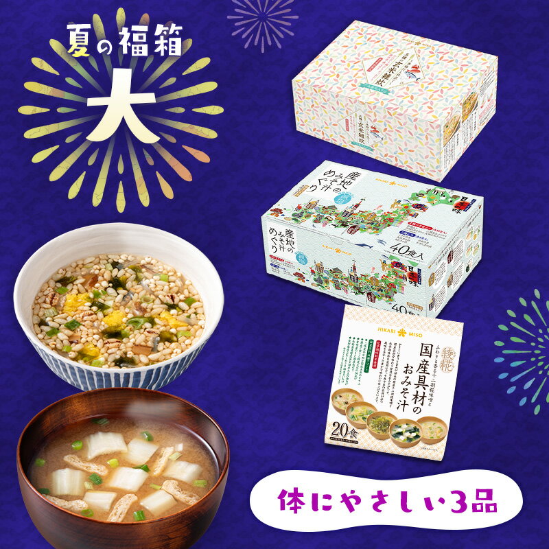*夏休み特別企画* 夏の福箱セット 2021体をおもいやる3品セット産地のみそ汁めぐり減塩40食 糸寒天入り五種の玄米雑炊15食 綾糀 国産具材のおみそ汁20食 食品 福袋 食物繊維 食品 福袋 予約 インスタント スープ ひかり味噌 メーカー直送 玄米 穀物